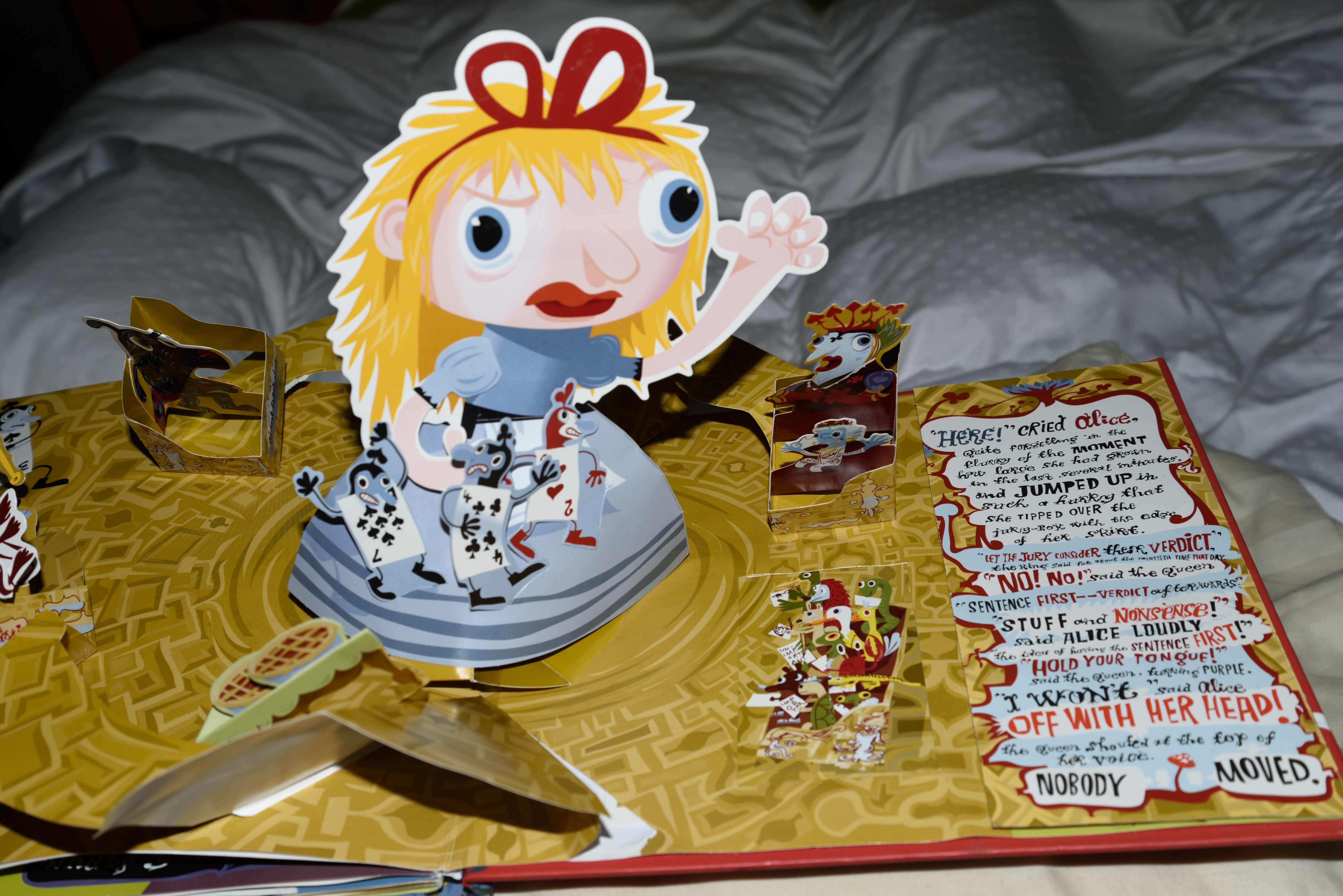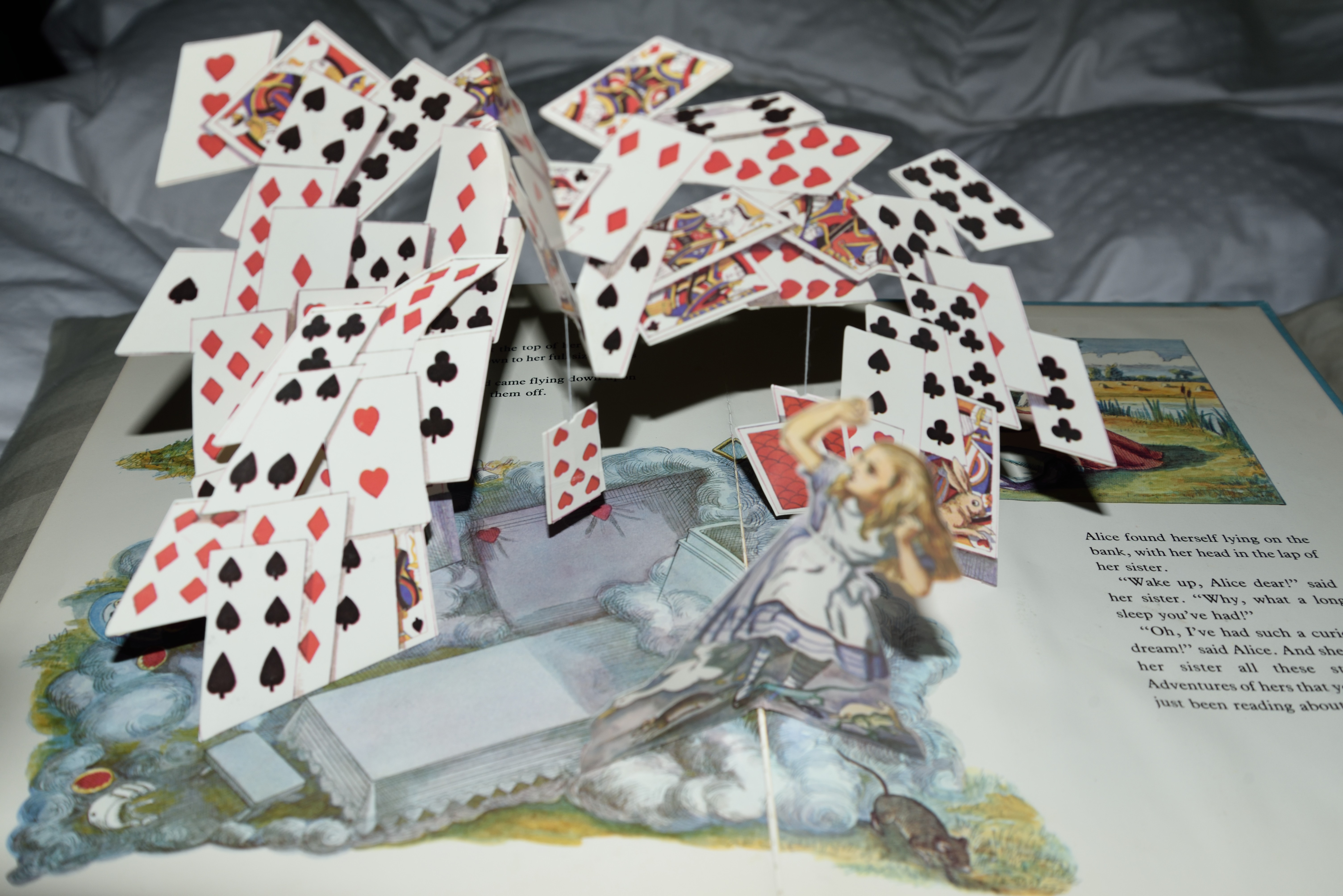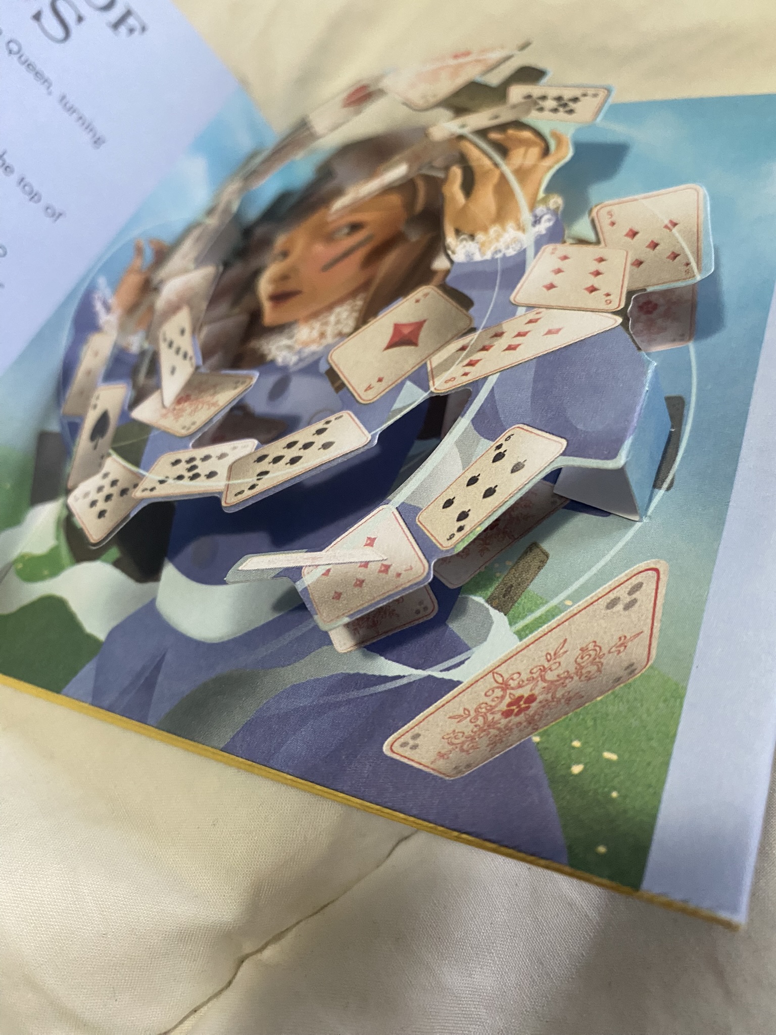 card-soldiers stuck to her, and they barely pop out at all. But Alice is a strong vertical pop-up, with her fist