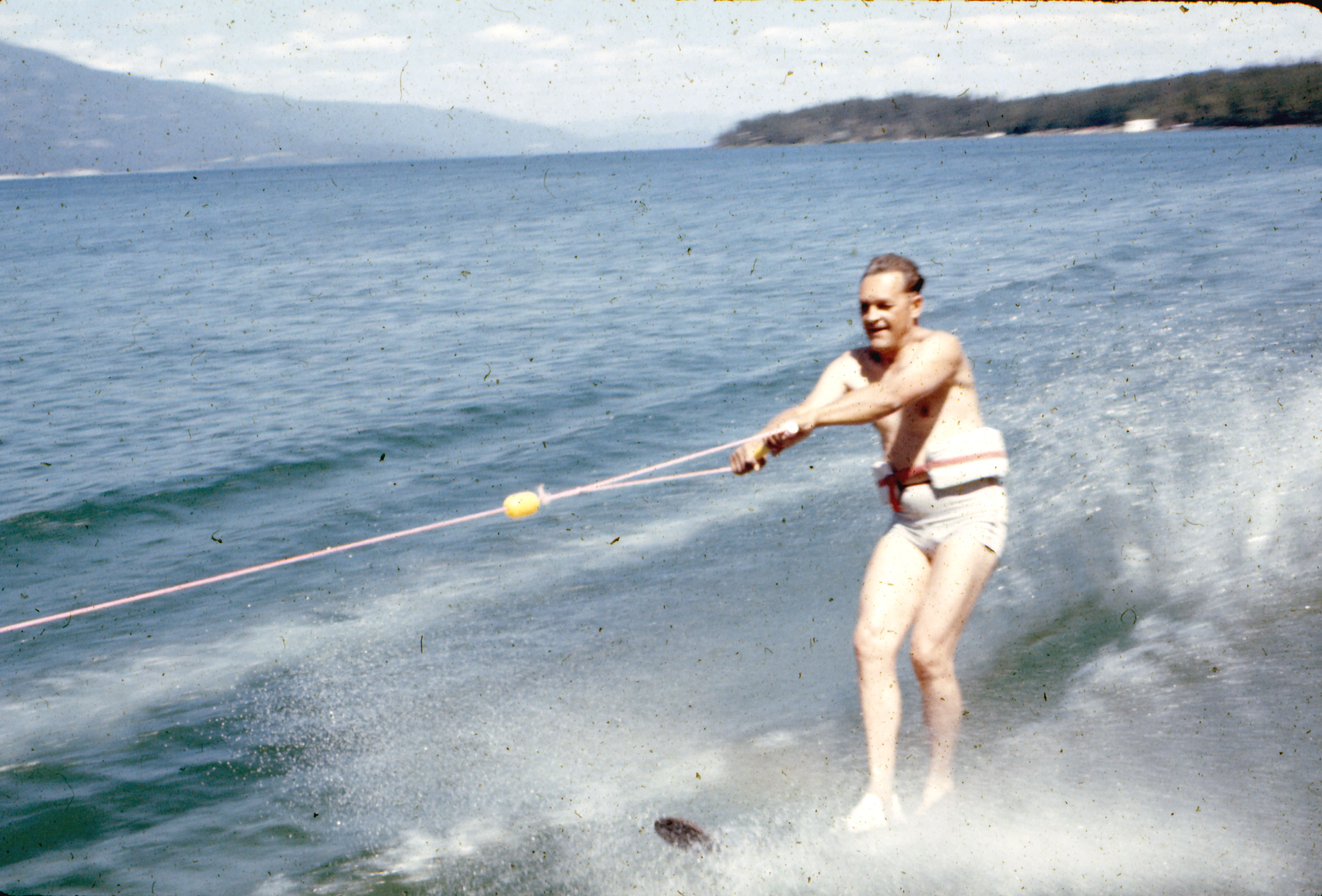 Speaking of dad, here he is water skiing on one ski. This is probably Couer d'Alene Lake near